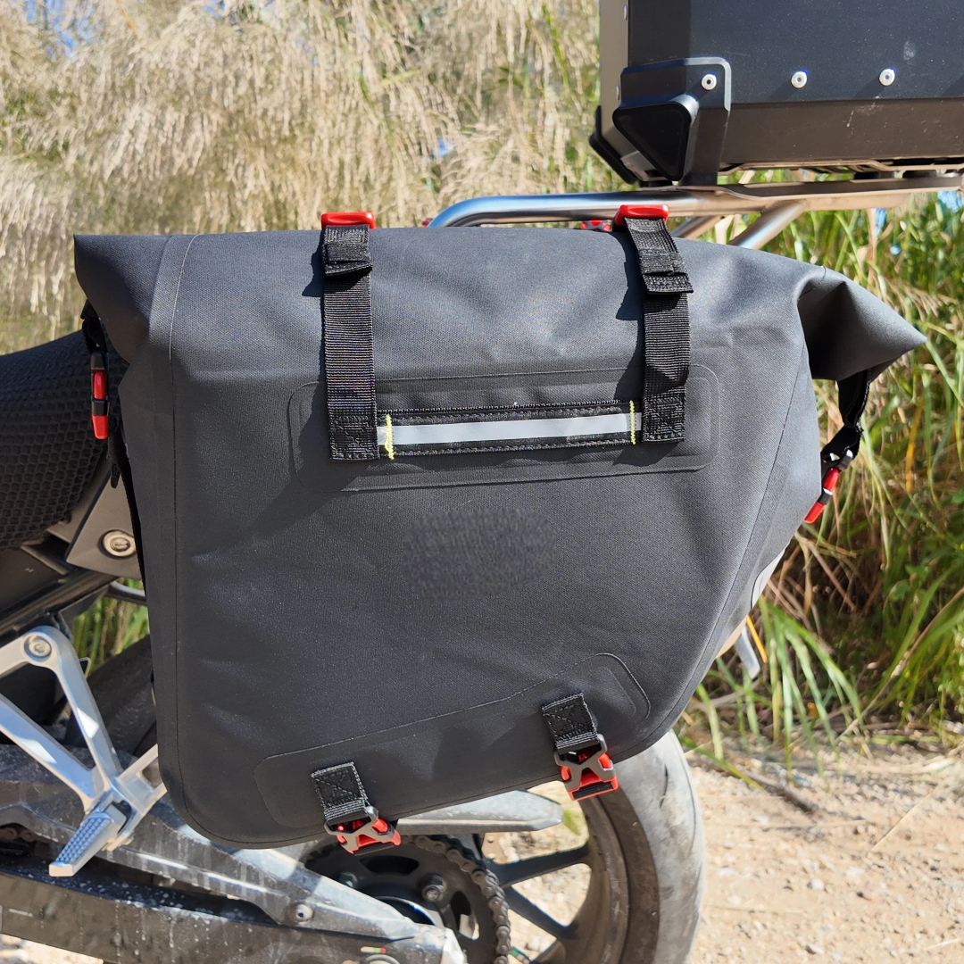 Material: 1000D High-Density PVC Tarpaulin Dimensions: 35(W) x (32-46.5)(H) x 23.5(D) cm Description: The ultimate heavy-duty choice. The ultra-strong 1000D fabric with a sleek glossy finish not only looks premium but is incredibly easy to wipe clean after a muddy ride.